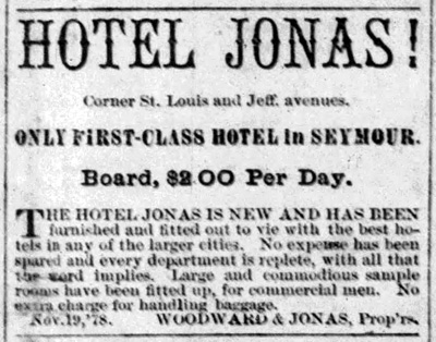 William and Charles E. Woodward opened the Hotel Jonas in Seymour in 1878. The hotel had been built by William's father, on the site of an earlier hotel he had operated when he first came to Seymour. The local newspaper said "the entire house is a model of beauty from top to bottom." An Iowa newspaper said "Seymour basked in the splendor of it's new hotel."21,22,23,24