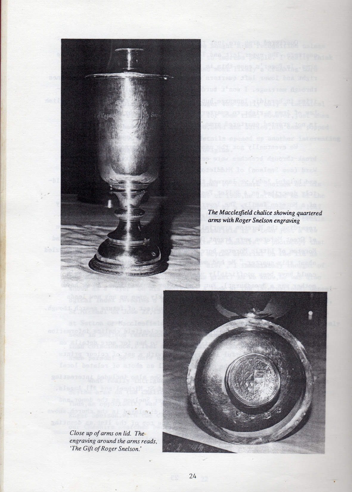 The hallmarks on the chalice are for 1624 - eighteen years before the gift was made, and ten years before the Visitation of London cited above .... so Roger the Dyer may have known about the quartered coat then, in 1624. The chalice and its lid each sport a SNELSON quadrant coat and were given by Roger de SNELSON to St. Michael's in Macclesfield in 1642 A.D.