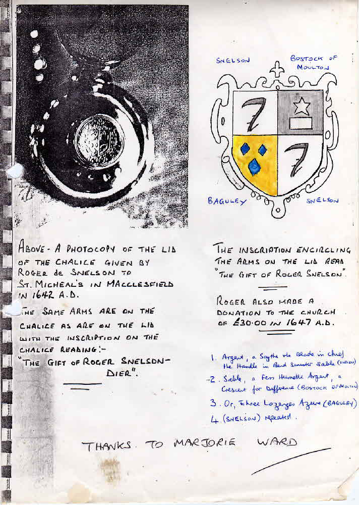 I am not sure who has actually seen the Chalice apart from Marjorie Ward (nee Snelson). My understanding is that the chalices are not very big and appear on Page 24 of the 1991 Supplement to Charles J Snelson's "A Snelson Genealogy". The quartered arms appear on the side of the chalice and on the lid. I believe that these photographs were originally taken and supplied to Charles by Marjorie. Ray Richards wrote in his book "Old Cheshire Churches" the following wonderful words ...