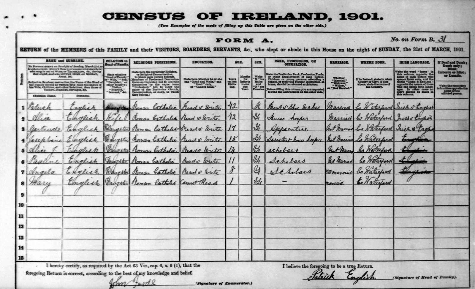 Census 1901 Ireland Dungarvan Patrick English a.42
