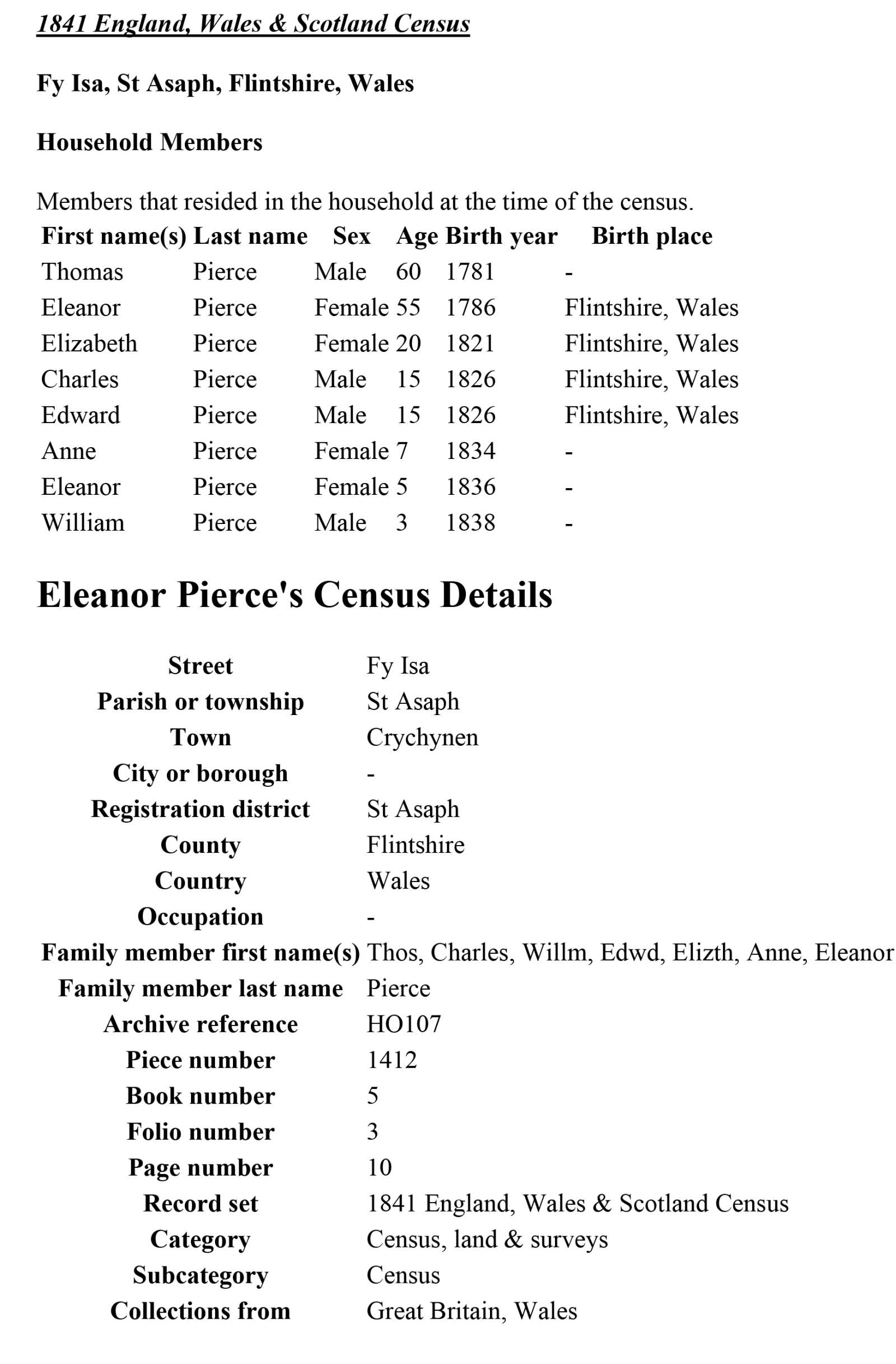 Census 1841 Flintshire Thomas Pierce a. 70