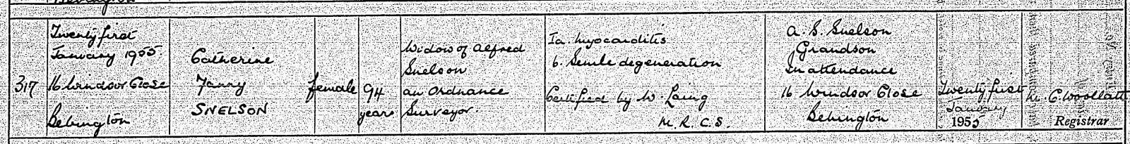 Death 1955 Cheshire Catherine Fanny Snelson a. 94