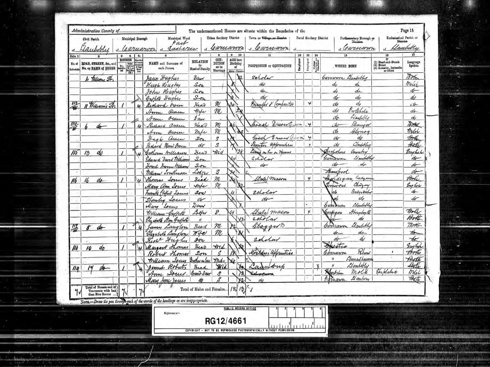 Census 1891 Caernarvon Margaret Thomas a.50 CAERG12_4661_4662-0046