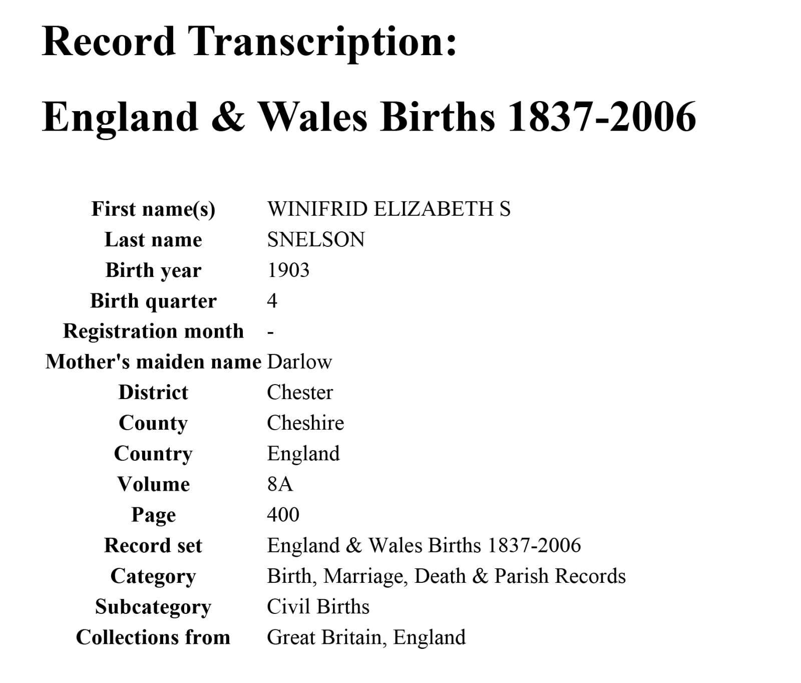 Birth Winifred Elizabeth Sofia Snelson c. July 1903