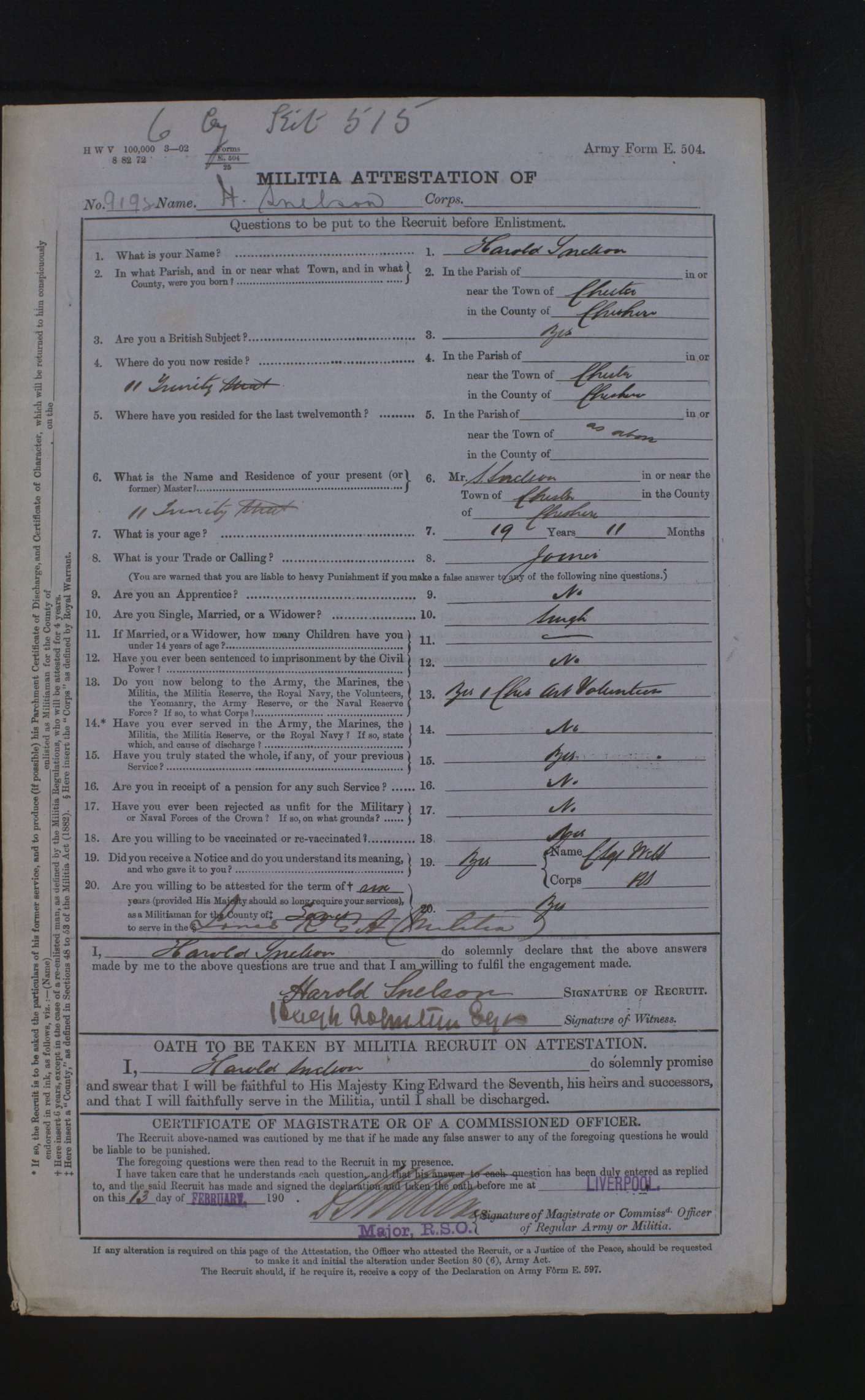 Harold Alfred Benyon Snelson -1903 Military Attestation