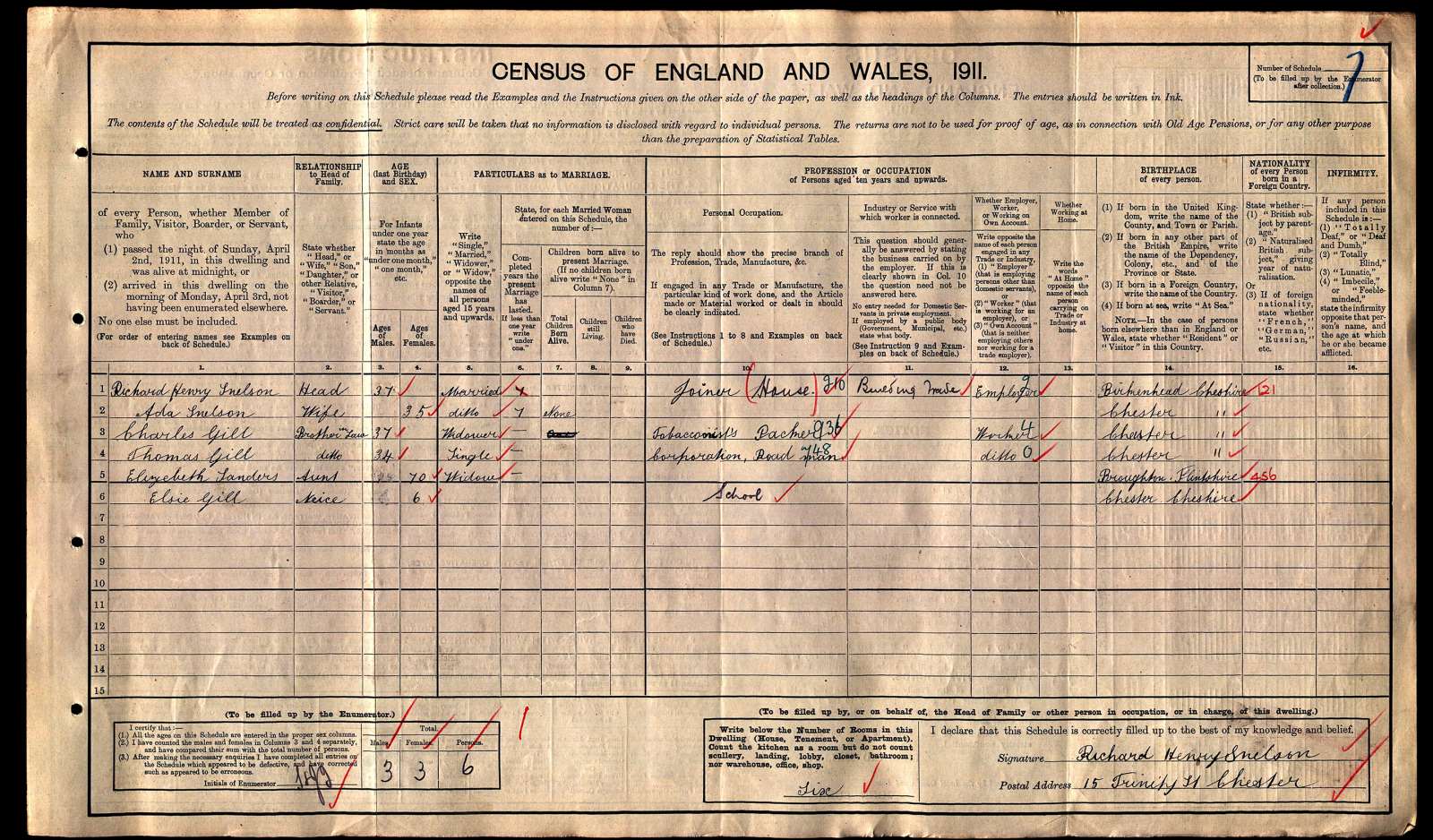 Census 1911 Cheshire Richard Henry Snelson a.37
