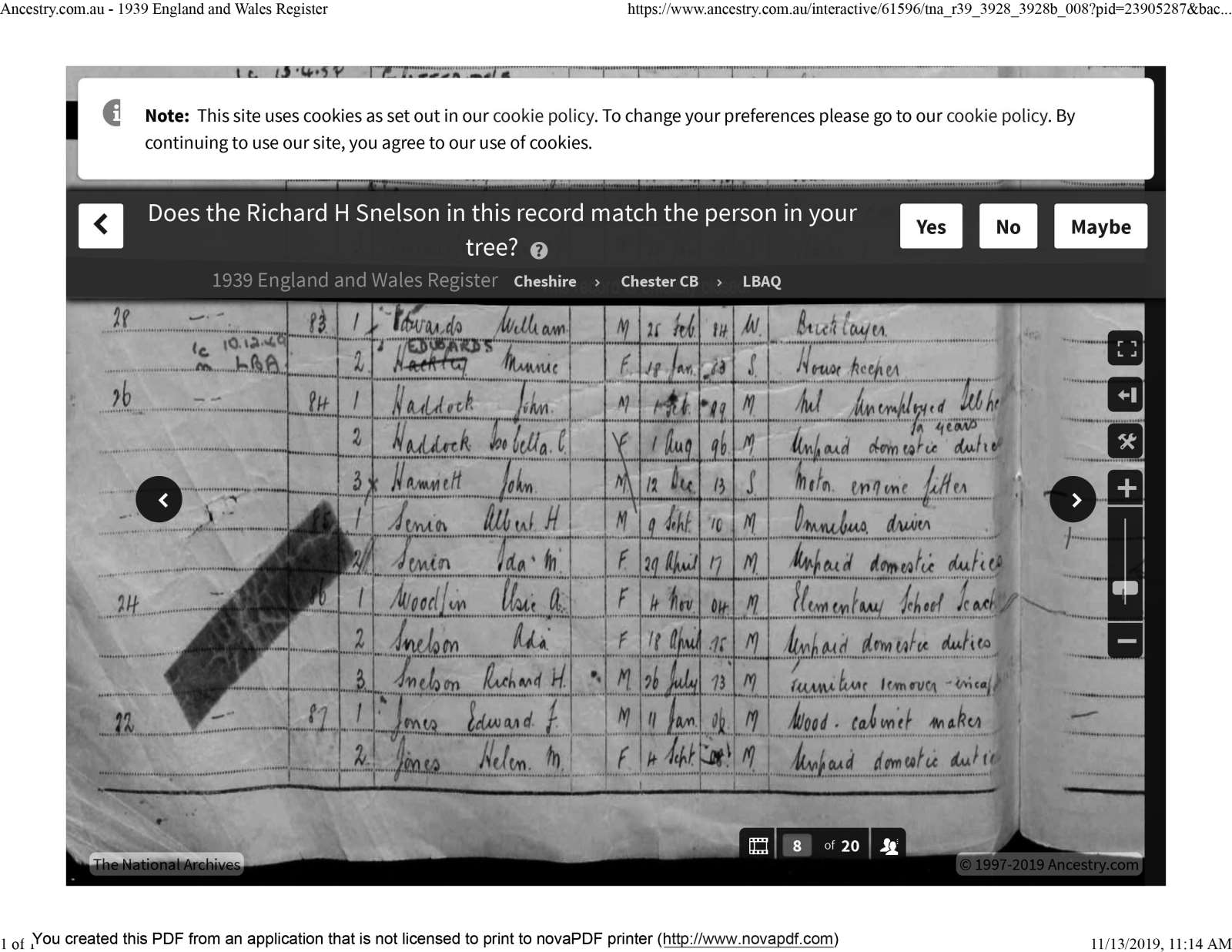 Census 1939 Cheshire Richard Henry Snelson b. 1873
