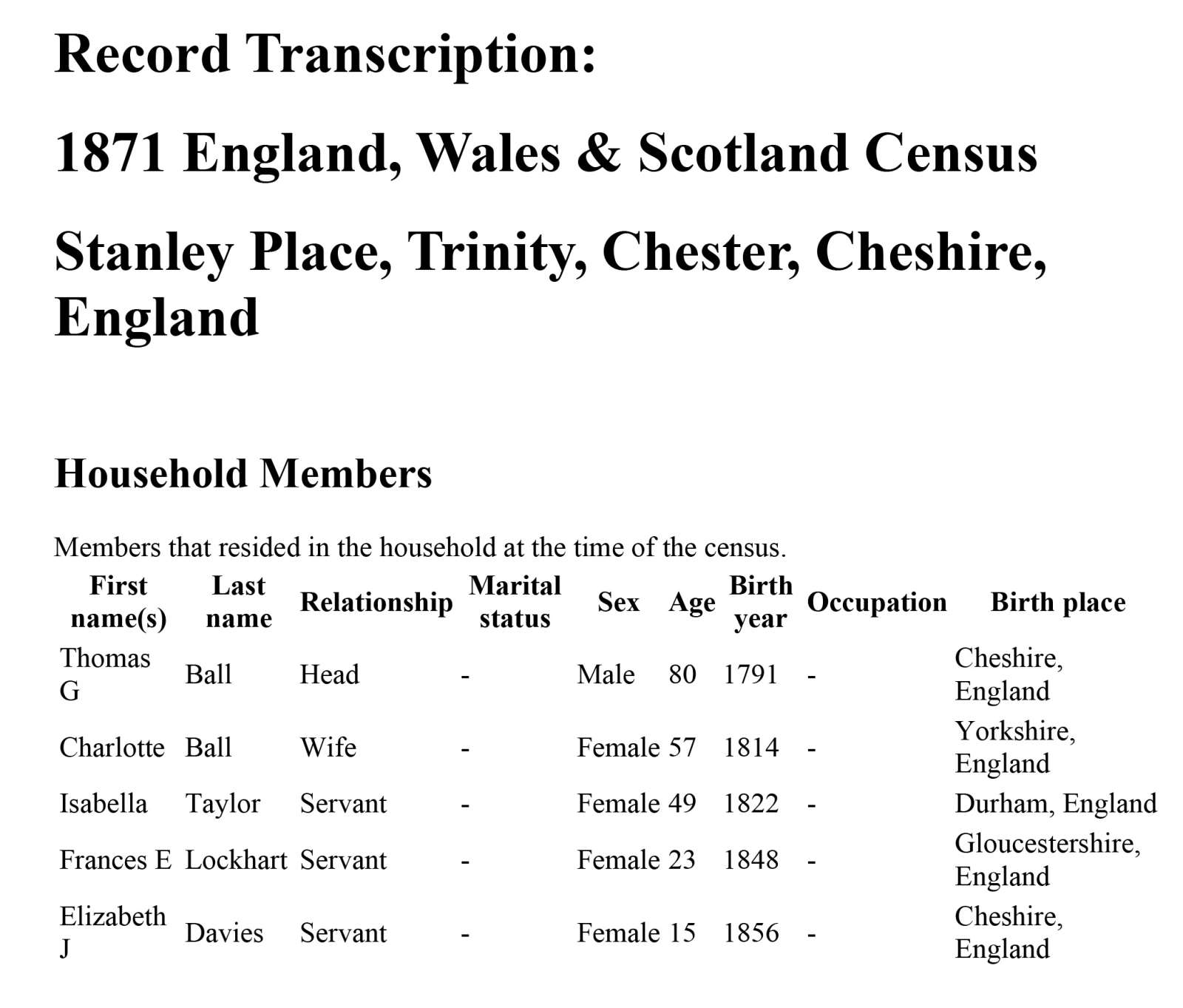 Census 1871 Cheshire Elizabeth Jane Davies a. 15