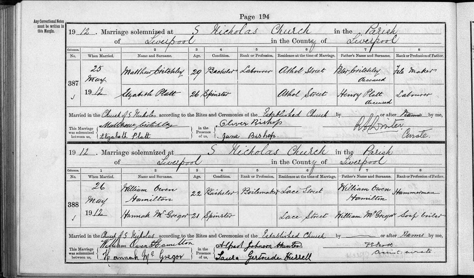 Marriage 1912 Lancashire Matthew Critchley + Elizabeth Platt