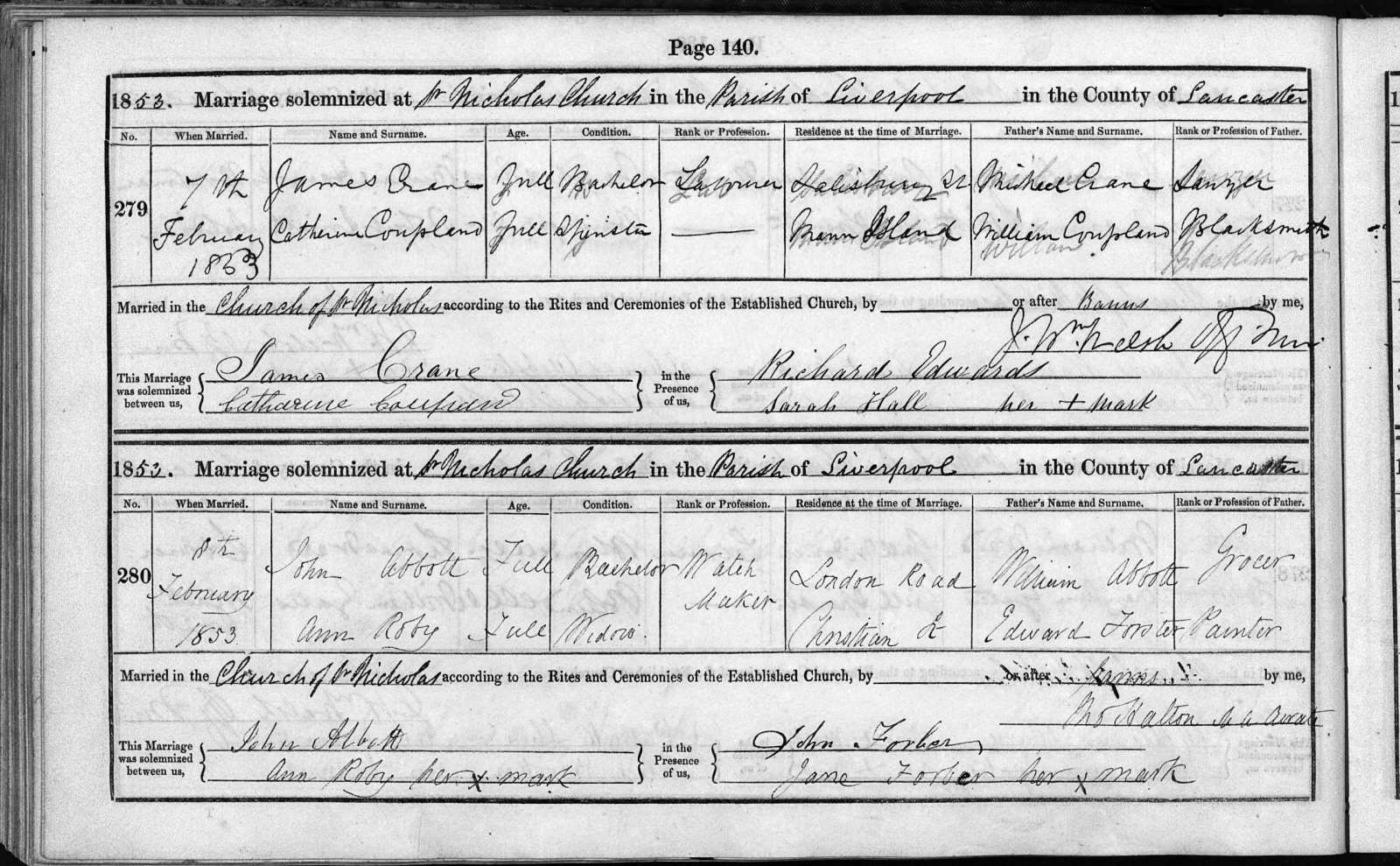 Marriage 1853 Lancashire Ann Foster John Abbott