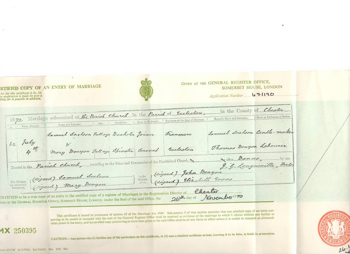 Marriage 1872 Samuel Snelson & Mary Benyon