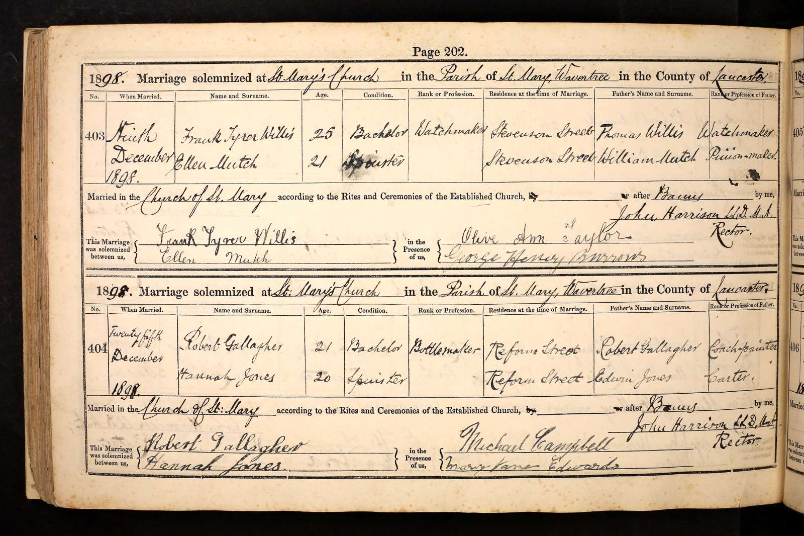 Marriage 1898 Lancashire Ellen Mutch a. 21