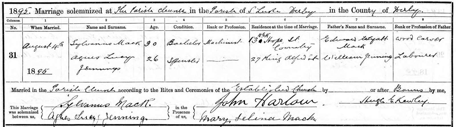 Marriage 1895 Derby Sylvanus Mack & Agnus Jennings
