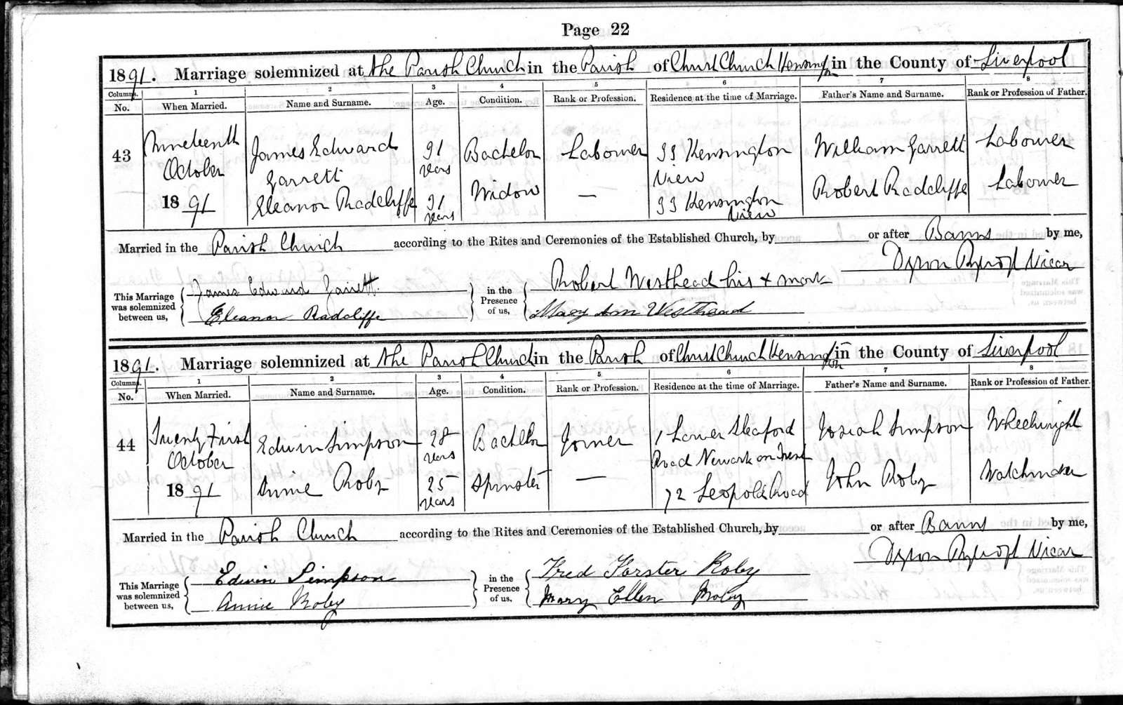 Marriage Certificate 1891 Ann Roby Edwin Simpson