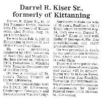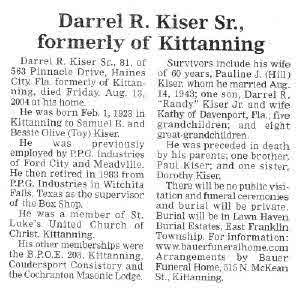 Darrel Randel Kiser Sr was born on 1 February 1923 at Kittanning, Armstrong, Pennsylvania.2 He married Pauline Jane Hill, daughter of Floyd Wymer Hill and Phoebe Jane Hooks, on 16 August 1943 at Kittanning, Armstrong, Pennsylvania.1 Darrel Randel Kiser Sr died on 13 August 2004 at home, Haines City, Florida, at age 81.2 He was buried on 16 August 2004 at Lawn Haven Burial Estates, East Franklin Township, Armstrong, Pennsylvania.2 His funeral was held at Baur Funeral Home, 515 N. McKean St., Kittanning, Armstrong, Pennsylvania, on 16 August 2004 www.bauerfuneralhome.com.2