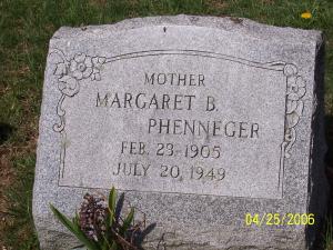 Margaret Bonsall was born on 23 February 1905. She married Paul Phennegar. Margaret Bonsall died on 20 July 1949 at age 44.1 She was buried on 23 July 1949 at Calvary Monument Cemetery, Christiana, Lancaster, Pennsylvania.1