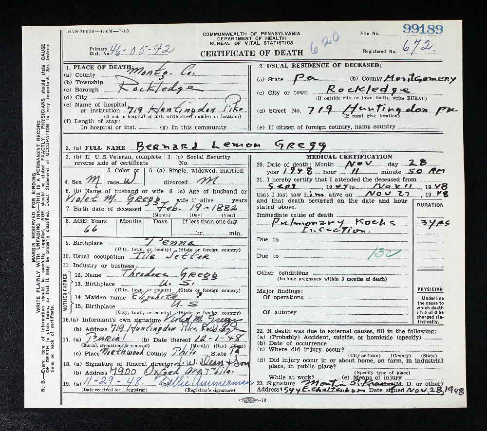 - [S32] Death Certificate, Pennsylvania, Philiadelphia City Death Certif, for Bernard Gregg # 5646, original at FAmily Search.