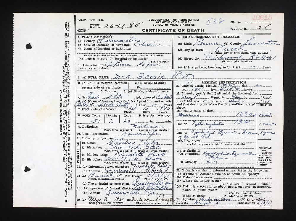 Bessie Taylor was born on 12 February 1890 at Michigan.2,3 She married J Clyde Rintz.3 Bessie Taylor died on 2 May 1941 at Kirkwood, Lancaster, Michigan, at age 51. Cause of death was Uramia due to spinal cord problem. Funeral Director was Carl Reynolds.2,3 She was buried on 5 May 1941 at Quarryville Cemetery, Quarryville, Lancaster, Pennsylvania.3