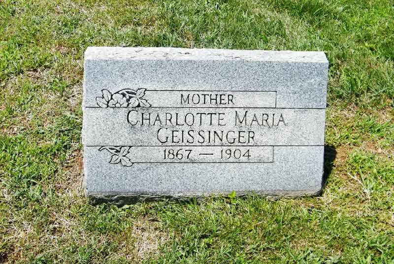 Charlotte Maria Hannum was born in 1867 at Chambersburg, Pennsylvania.1 She married Charles Henry Geissinger, son of John G Geissinger and Abigal Wahf.1 Charlotte Maria Hannum died on 24 February 1904 at Home, Broad St, Oxford, Chester, Pennsylvania.1,2 She was buried on 26 February 1904 at Oxford Cemetery, Oxford, Chester, Pennsylvania.3 Charlotte Maria Hannum Find-a-Grave.com ID # 90017921.