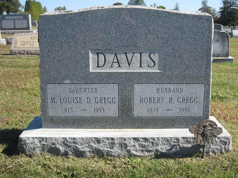 Margaret Louise Davis was born in 1915.2 She married Robert Richard Gregg, son of Miller Vandegrift Gregg and Mamie Edna Geissinger, on 14 September 1945 at Home of the bride, 210 Capitol Trail, Newark, Delaware.1,3 Margaret Louise Davis was buried in 1983 at Oxford Cemetery, Oxford, Chester, Pennsylvania.2 She died in 1983.2 Margaret Louise Davis Find-a-Grave.com ID # 118795514.