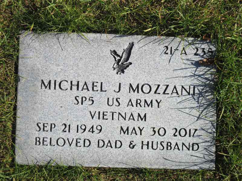 Michael Joseph Mozzani was born on 21 September 1949.1 He married Pamela Thompson, daughter of Norman Lafayette Thompson and Genevieve Gregg, on 24 May 1969.1 Michael Joseph Mozzani and Pamela Thompson were divorced in April 1979.1 Michael Joseph Mozzani died on 30 May 2017 at Chester, Pennsylvania, at age 67; Committed suicide.2 He was buried on 5 June 2017 at Indiantown Gap National Cemetery, Annville, Lebanon, Pennsylvania. Section 21-1 site 235.3 Michael Joseph Mozzani Find-a-Grave.com ID # 194729347.