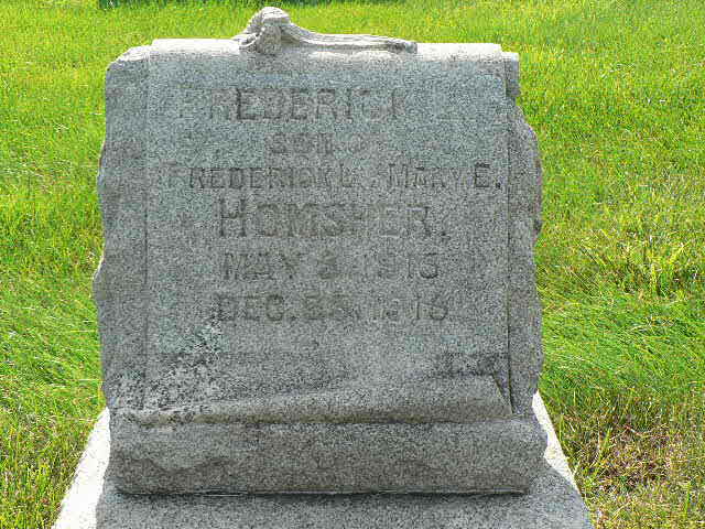 Frederick Lloyd Homsher Jr was born on 5 May 1915 at Strasburg, Lancaster, Pennsylvania.1 He died on 25 December 1915.1 He was buried on 28 December 1916 at Strasburg Mennonite Cemetery, Strasburg Township, Lancaster, Pennsylvania; Cemetery book states year as 1915.2 Frederick Lloyd Homsher Jr Find-a-Grave.com ID # 21290763.