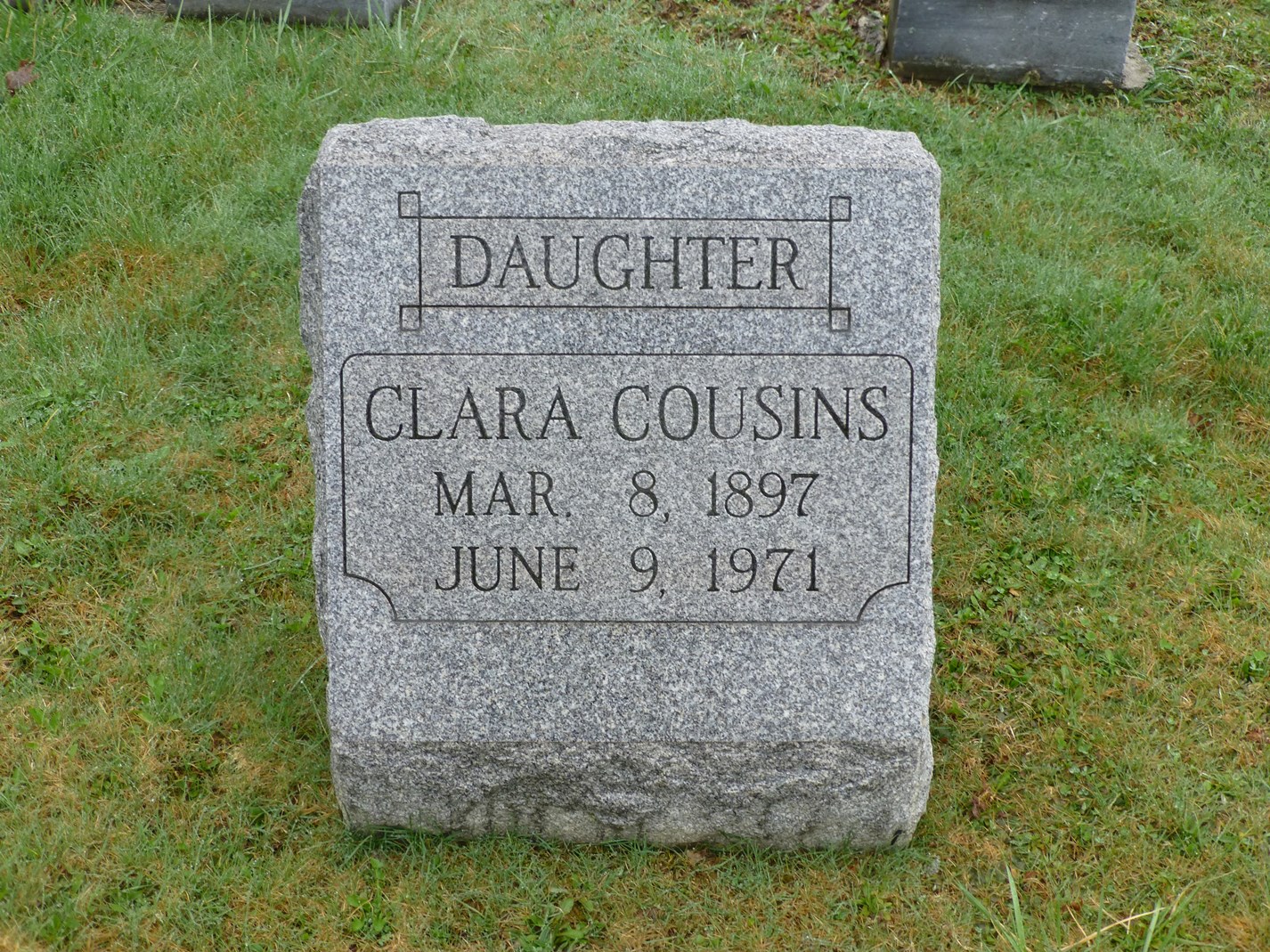 Clare D Cousins was born on 8 March 1897 at Stewardson Furnace, Pine Twp, Armstrong, Pennsylvania.1,2 She died on 9 June 1971 at Johnstown, Cambria, Pennsylvania, at age 74.2 She was buried on 12 June 1971 at Grandview Cemetery, Johnstown, Cambria, Pennsylvania.2 Clare D Cousins Find-a-Grave.com ID # 101076243.