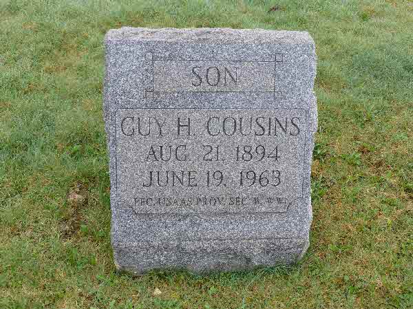 Guy Henry Cousins was born on 21 August 1894 at Mahoning, Armstrong, Pennsylvania.1,2 He died on 19 June 1963 at Johnstown, Cambria, Pennsylvania, at age 68.2 He was buried on 22 June 1963 at Grandview Cemetery, Johnstown, Cambria, Pennsylvania.2 Guy Henry Cousins Find-a-Grave.com ID # 101075688.