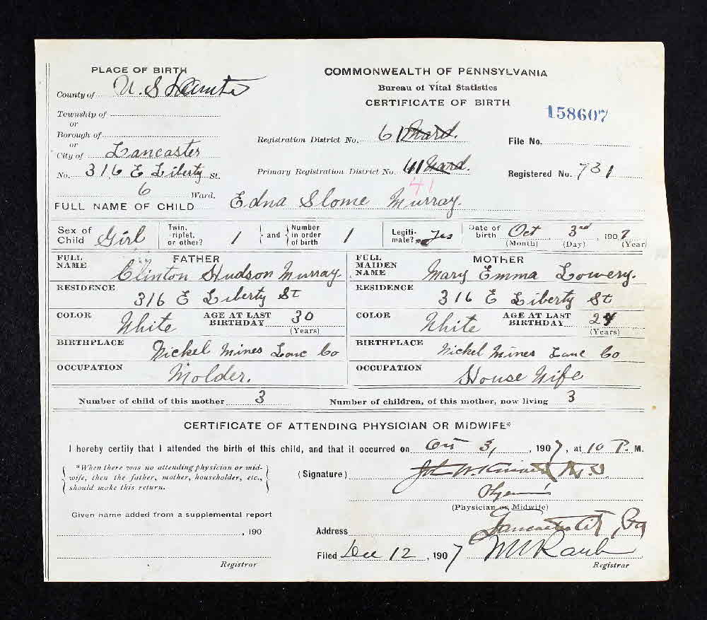 Edna Slome Murray was born on 3 October 1907 at 316 E Liberty St, Lancaster, Lancaster, Pennsylvania.1,3,2 She married Earl L. Harrison, son of John Harrison and Sarah Harrison, circa 1926.1 Edna Slome Harrison died on 30 August 1997 at St Joseph's Hospital, Lancaster, Lancaster, Pennsylvania, at age 89, and her cause of death was Heart Failure. Obit lists as surviving 6 grandchildren, 12 great grandchildren and step brother.1,4 She was buried on 3 September 1997 at Riverview Burial Park, Lancaster, Lancaster, Pennsylvania. Grave # MMT 1140-6.1,4