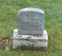 Anna B Cousins was born on 18 December 1898.1,2 She died on 3 October 1903 at Johnstown, Cambria, Pennsylvania, at age 4.2 She was buried on 6 October 1903 at Grandview Cemetery, Johnstown, Cambria, Pennsylvania.2 Anna B Cousins Find-a-Grave.com ID # 101075446.