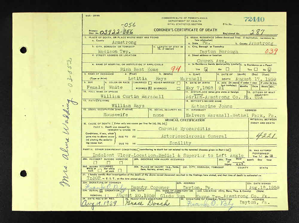 - [S32] Death Certificate, Pennsylvania Death Certificates 1906-1963. Certificate # 72440.