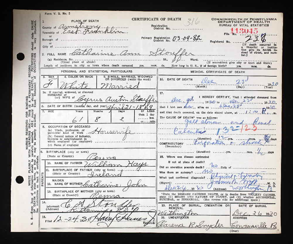 - [S32] Death Certificate, Pennsylvania Death Certificates 1906-1963. Certificate # 113045.