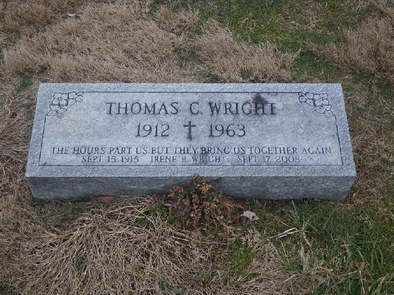 Thomas Chester Wright was born on 1 June 1912 at Chester, Pennsylvania.2,3 He married Irene McFalls, daughter of Frank William McFalls and Kathrine Anna Keller, on 17 December 1932 at Elkton, Maryland; License to wed issued at Elkton, Maryland, Saturday, Dec 10, 1932.4 Thomas Chester Wright died on 5 July 1963 at Off RT 222, Provindence Township, Lancaster, Pennsylvania, at age 51. Cause of death was acute myocardial infarction and vascular disease. Happened during hunting trip.3 He was buried on 9 July 1963 at Strasburg Mennonite, Strasburg, Lancaster, Pennsylvania.3 Thomas Chester Wright Find-a-Grave.com ID # 30039860.