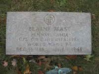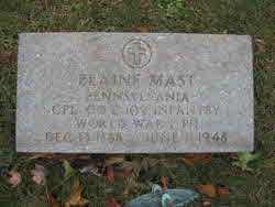 Blaine F. Mast was born on 18 December 1888 at Armstrong, Pennsylvania.2 He married Dessie Yates. Blaine F. Mast died on 11 June 1948 at age 59.2 He was buried on 14 June 1948 at St Mary's Episcopal Cemetery, Madison Township, Armstrong, Pennsylvania,row 7, plot 10.2,3 Blaine F. Mast Find-a-Grave.com ID # an unknown place ; 44591906.2