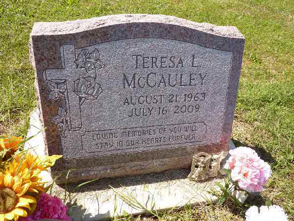 Teresa Louise McCauley was born on 21 August 1963.1,2 She died on 16 July 2009 at Lancaster, Pennsylvania, at age 45.3 She was buried on 19 July 2009 at Georgetown Methodist Cemetery, Bart, Lancaster, Pennsylvania.4 Teresa Louise McCauley Find-a-Grave.com ID # 84313366.
