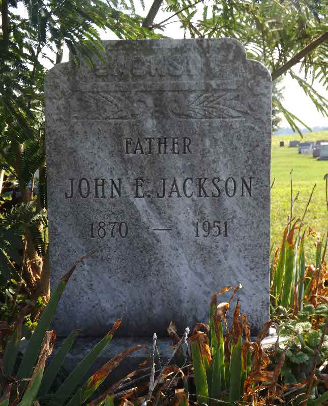 John Evans Jackson was born on 23 September 1870 at Cecil, Maryland.1,3 He married Louisa Marie Harris, daughter of Philip Thomas Harris and Arley Cora Nash, in March 1903.1 John Evans Jackson died on 19 October 1951 at Drumore, Lancaster, Pennsylvania, at age 81.1,3 John Evans Jackson Find-a-Grave.com ID # 139665209.