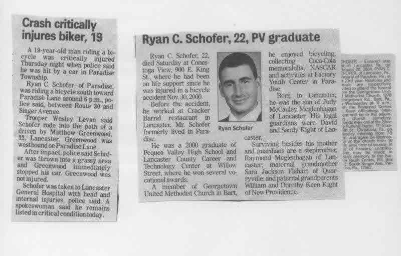 Ryan Christopher Schofer was born on 22 July 1972.1 He died on 28 February 2004 at Conestoga View, Lancaster, Lancaster, Pennsylvania, at age 31.2 He was buried on 1 March 2004 at United Methodist Cemetery, Georgetown (Bart), Lancaster, Pennsylvania; Had been on life support since Nov 30 2000.2