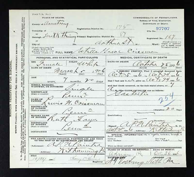 Grace Estella Crissman was born on 5 March 1906 at Armstrong, Pennsylvania.1,2 She died on 25 October 1906 at West Kittanning, Armstrong, Pennsylvania.1,2 She was buried on 28 October 1906 at Saint Marks Lutheran Church Cemetery, Adrian, Armstrong, Pennsylvania.2 Grace Estella Crissman Find-a-Grave.com ID # 25332772.