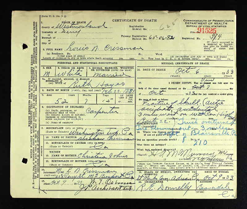 From: The Simpson's Leader-Times, Kittanning, Pennsylvania, on Saturday October 7, 1933, Page 1.1,2 He was buried on 9 October 1933 at Saint Marks Lutheran Church Cemetery, Adrian, Armstrong, Pennsylvania.2 Lewis Nelson Crissman Find-a-Grave.com ID # 25332773.