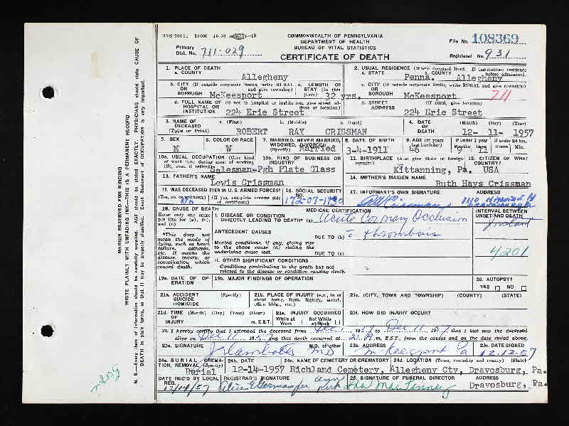 Ruby Catherine Crissman was born on 7 July 1914 at Kittanning, Armstrong, Pennsylvania.1,2 She died on 24 October 1933 at McKeesport, Allegheny, Pennsylvania, at age 19. Her obituary reads: Miss Ruby Crissman, aged 19 years daughter of the late L. N. Crissman and Mrs. Ruth Hays Crissman, died at her home in McKeesport Tuesday morning following a short illness. The Crissman family formerly lived in West Kittanning. Mr. Crissman was killed just two weeks ago in an automobile accident. The deceased is survived by her mother, three brothers, Raymond, Robert, and Dent at home and one sister, Virginia at home. The funeral cortege will leave the home in McKeesport at 9 o’clock Friday morning and services will be held in St. Mark’s Lutheran church at Montgomeryville at 12 o’clock.