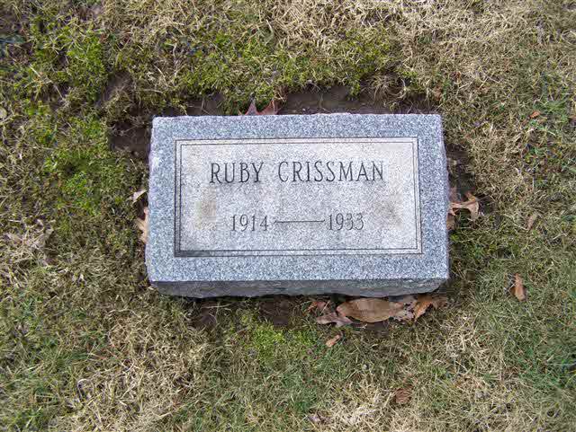 - Ruby Catherine Crissman1 b. 7 Jul 1914, d. 24 Oct 1933