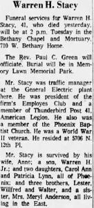 - [S30] Newspaper Obit, Arizona Republic, Phoenix, Arizona, March 26 1961, page 75 for Warren H Stacy Sr.