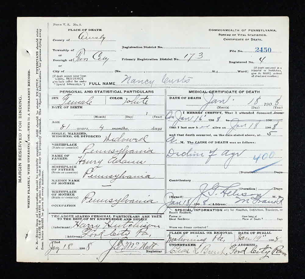 - [S32] Death Certificate, Pennsylvania Death Certificates 1906-1963. Certificate # 46076.