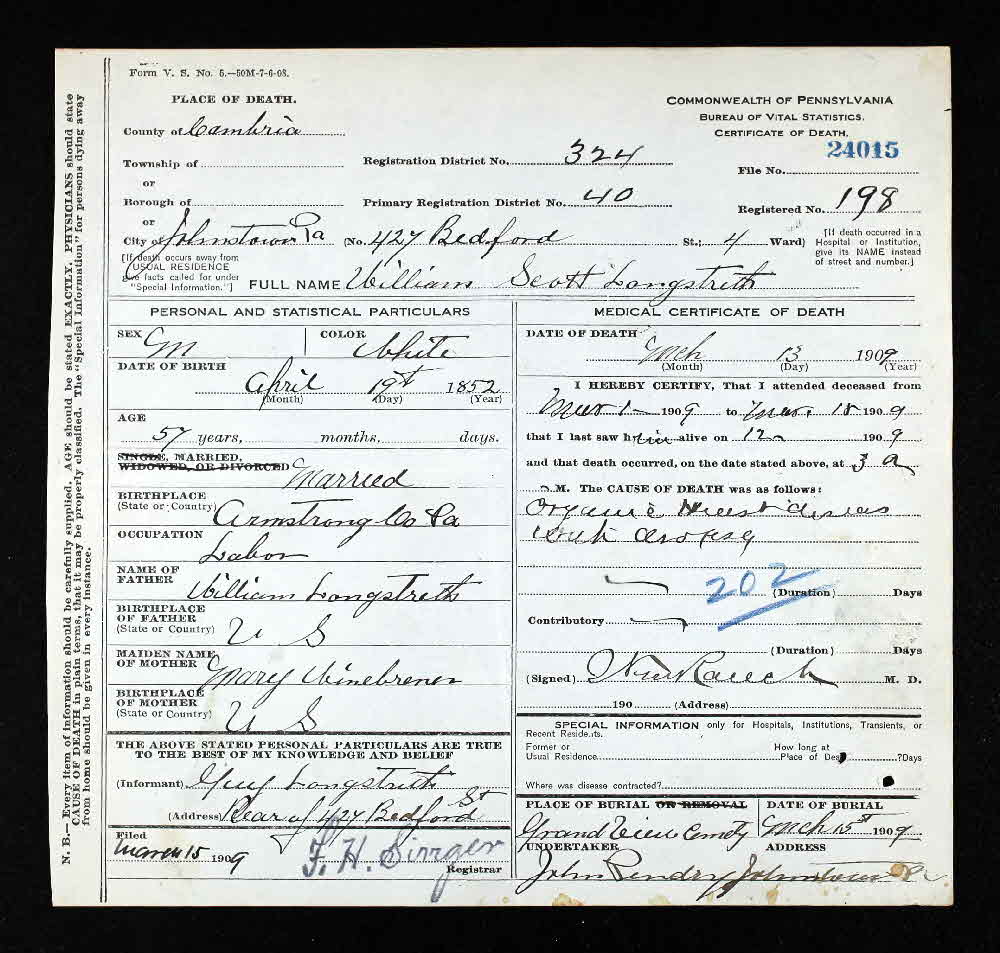 William Scott Longstreth was born on 19 April 1852 at Armstrong, Pennsylvania.1,2,3 He married Sarah Margaret Mack circa 1873.4 William Scott Longstreth died on 13 March 1909 at 427 Bedford St, Johnstown, Cambria, Pennsylvania, at age 56. Cause of death was heart disease with dropsy.2,3 He was buried on 15 March 1909 at Grandview Cemetery, Johnstown, Cambria, Pennsylvania.2,3 William Scott Longstreth Find-a-Grave.com ID # 105197134.