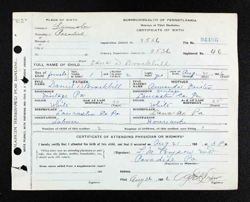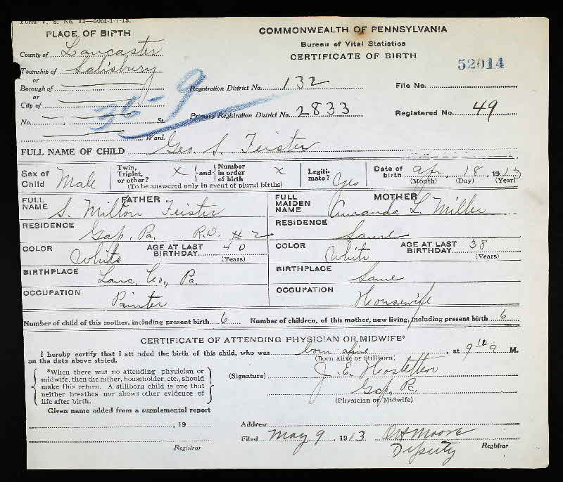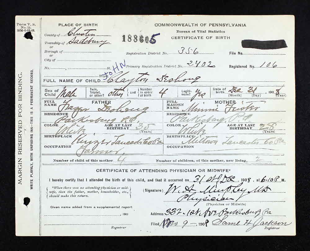 - [S29] Birth Records entry, State Registration, Pennsylvania birth certificate # 108717.