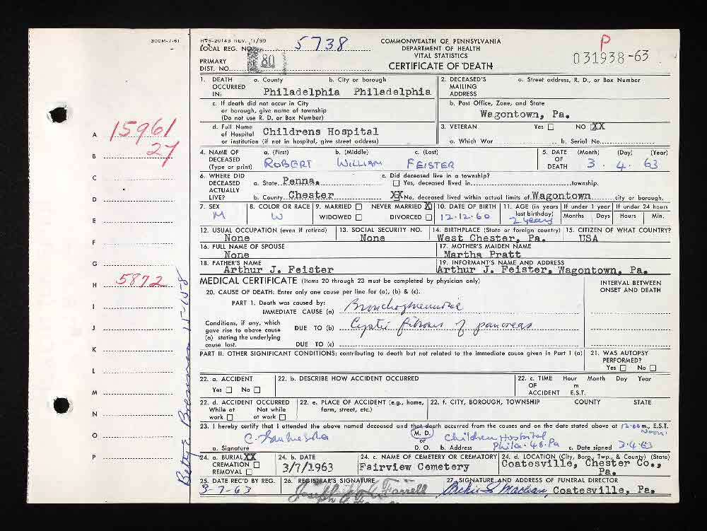 Robert William Feister was born on 12 December 1960 at Chester County Hospital, West Chester, Chester, Pennsylvania.1 He died on 4 March 1963 at Children's Hospital of Philadelphia, Philadelphia, Pennsylvania, at age 2. Cause of death was broncopneumonia.1,2 He was buried on 7 March 1963 at Fairview Cemetery, Coatesville, Chester, Pennsylvania.2 Robert William Feister Find-a-Grave.com ID # an unknown place ; 205713007.