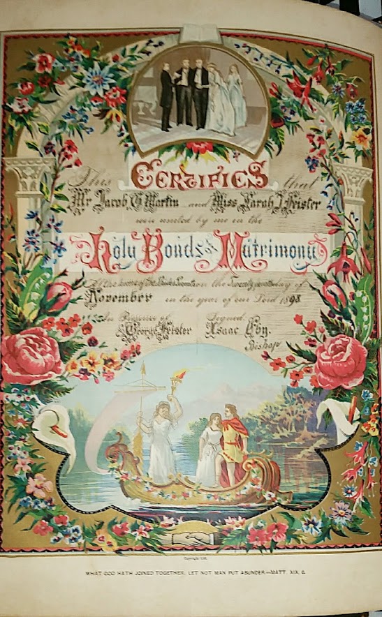 Jacob Gabel Martin was born on 25 April 1864 at Lancaster, Pennsylvania.2 He married Sarah Feister, daughter of Jacob S. Feister and Elizabeth Jane Lafferty, on 24 November 1898 at home of brides parents, Sadsbury Township, Lancaster, Pennsylvania, by Bishop Isaac Eby.1,4 Jacob Gabel Martin died on 3 May 1911 at Lancaster, Pennsylvania, at age 47.5,6 He was buried on 6 May 1911 at Old Road Mennonte Cemetery, Gap, Lancaster, Pennsylvania.5 Jacob Gabel Martin Find-a-Grave.com ID # 27170465.
