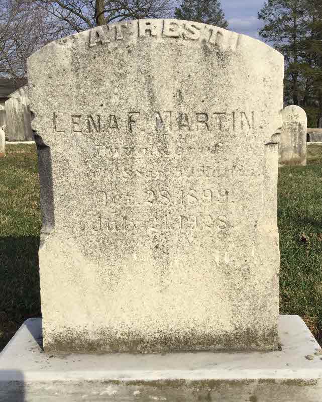 Lena Feister Martin was born on 28 October 1899 at Lancaster, Pennsylvania.1,3 She died on 21 July 1928 at Leacock Township, Lancaster, Pennsylvania, at age 28.Cause of death was uterine cancer.3,4 She was buried on 24 July 1928 at White Horse Cemetery (Old Road Mennonite Cemetery, Gap, Lancaster, Pennsylvania.4 Lena Feister Martin Find-a-Grave.com ID # 27170464 + family links.
