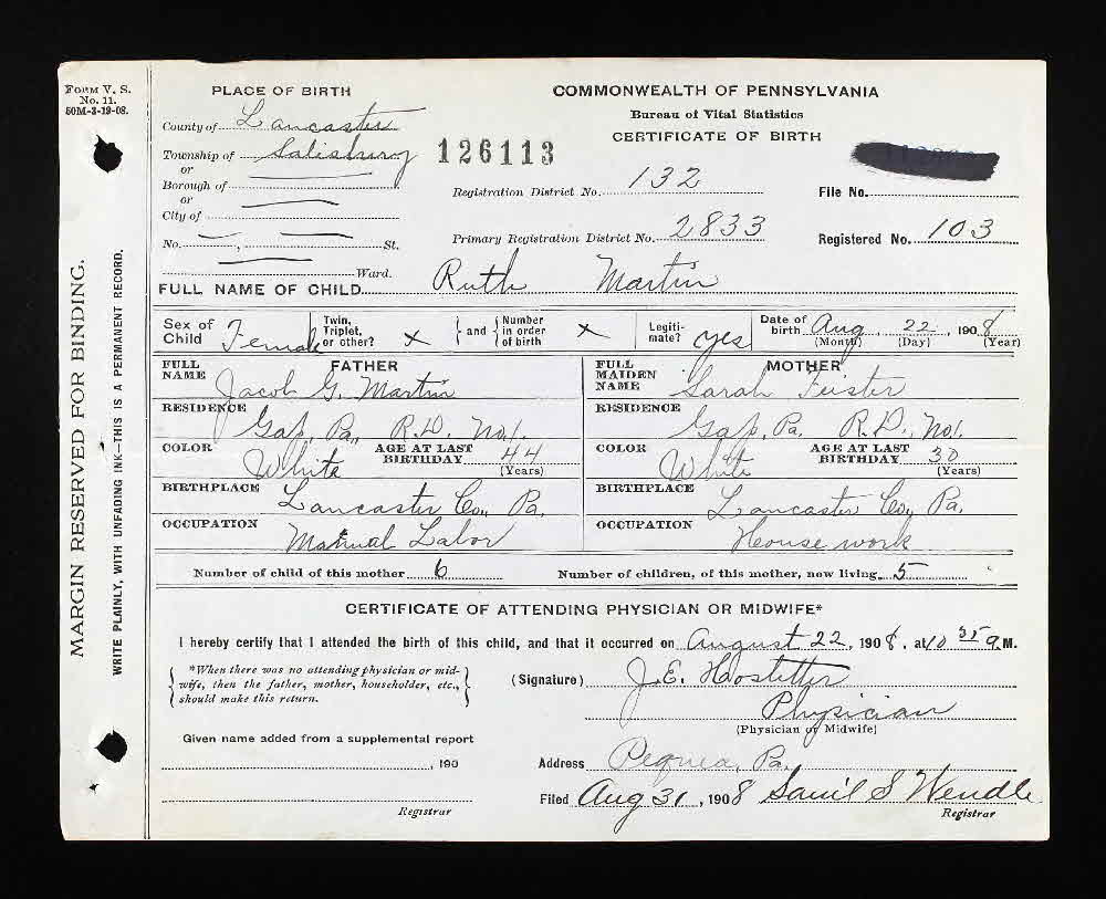 - [S29] Birth Records entry, State Registration, Pennsylvania birth certificate # 126113 for daughter Ruth Martin.