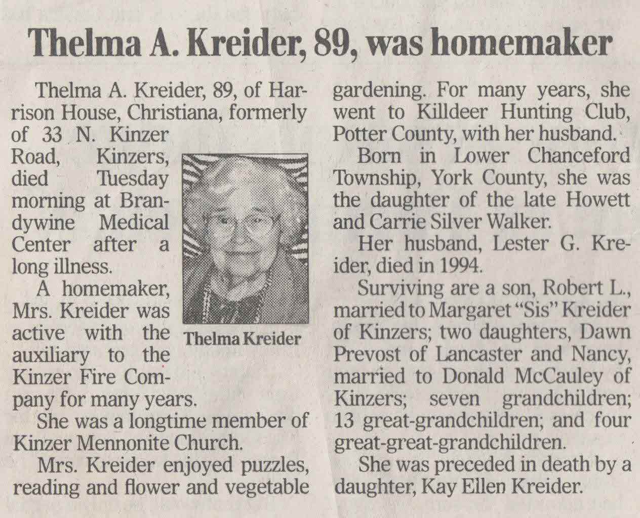 Thelma A. Kreider, 89, of Harrison House and formerly of 33 North Kinzer Road, Kinzers, died at Brandywine Medical Center on Tuesday, December 30, morning following a lengthy illness.